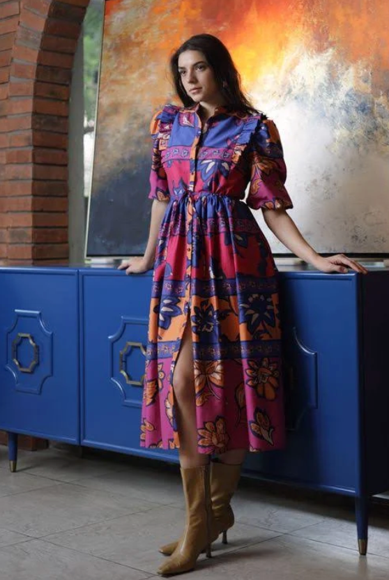 Bold, bright, and statement-making, the Sabrina Dress offers effortless style. Featuring a vibrant mix of fuchsia, tangerine, and cobalt in a large-scale floral print, this button-front midi dress brings playful sophistication to any occasion.