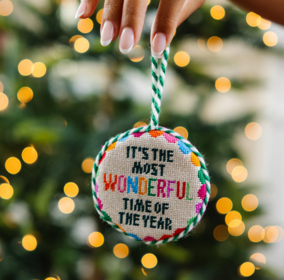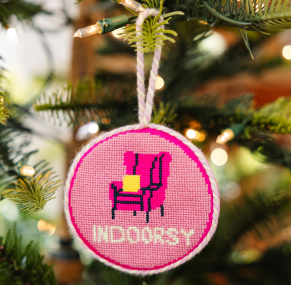 These cheeky needlepoint ornaments celebrate your favorite things—whether it's a martini, a slice of pizza, or a passport stamp. Hand-stitched and backed in luxe velvet, they’re festive, funny, and just the right amount of extra.