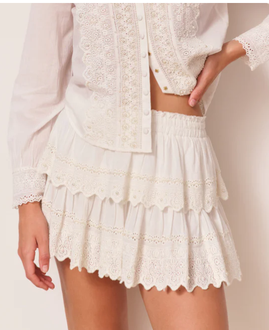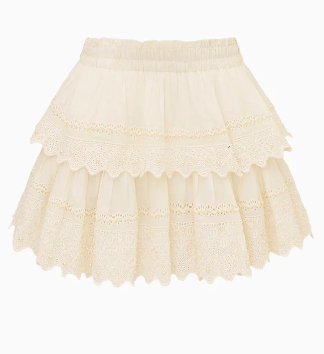 Ruffle Mini Skirt, adorned with dainty pearls for a fresh touch of romance. This signature silhouette features tiers of playful ruffles that cascade into a flounced hem, finished with an easy elasticated waistband. Feminine, flirty, and endlessly versatile. This skirt is designed to be worn from daytime adventures to dreamy evenings out.