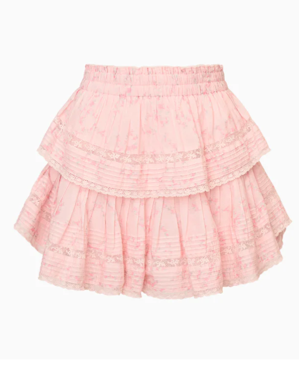 Loveshackfancy's best-selling Ruffle Mini Skirt returns for the season with organic cotton voile fabric arriving with our signature bow fleur print reimagined into tiny ditsy florals printed all over. She features intricate inset lace trims and allover pintuck details. The elasticated waistband offers flexibility in comfort and styling. Tiered ruffles exude effortless femininity. The mini is finished with a frayed, raw hem for added playfulness.
