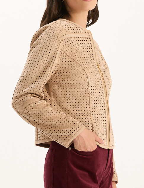 Crafted in soft faux suede fabric, the Piper Jacket has a luxurious feel and contemporary edge. The silhouette features a collarless design, gold zip-front closure, and allover perforated detailing that adds textural interest and modern flair. Perfect for pairing with everything from jeans to dresses, it brings just the right amount of polish to any outfit.