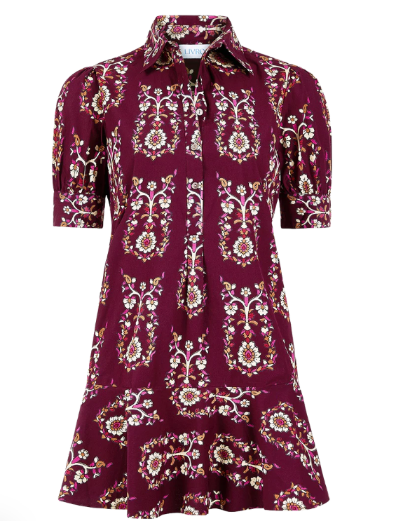 The Liv Dress is a playful mini dress with a tailored bodice and a relaxed drop-waist silhouette. It features short puff sleeves with cuff detailing, a classic shirt collar, and a partial button placket down the front. The skirt is finished with a flounced hem for a feminine, swingy shape.