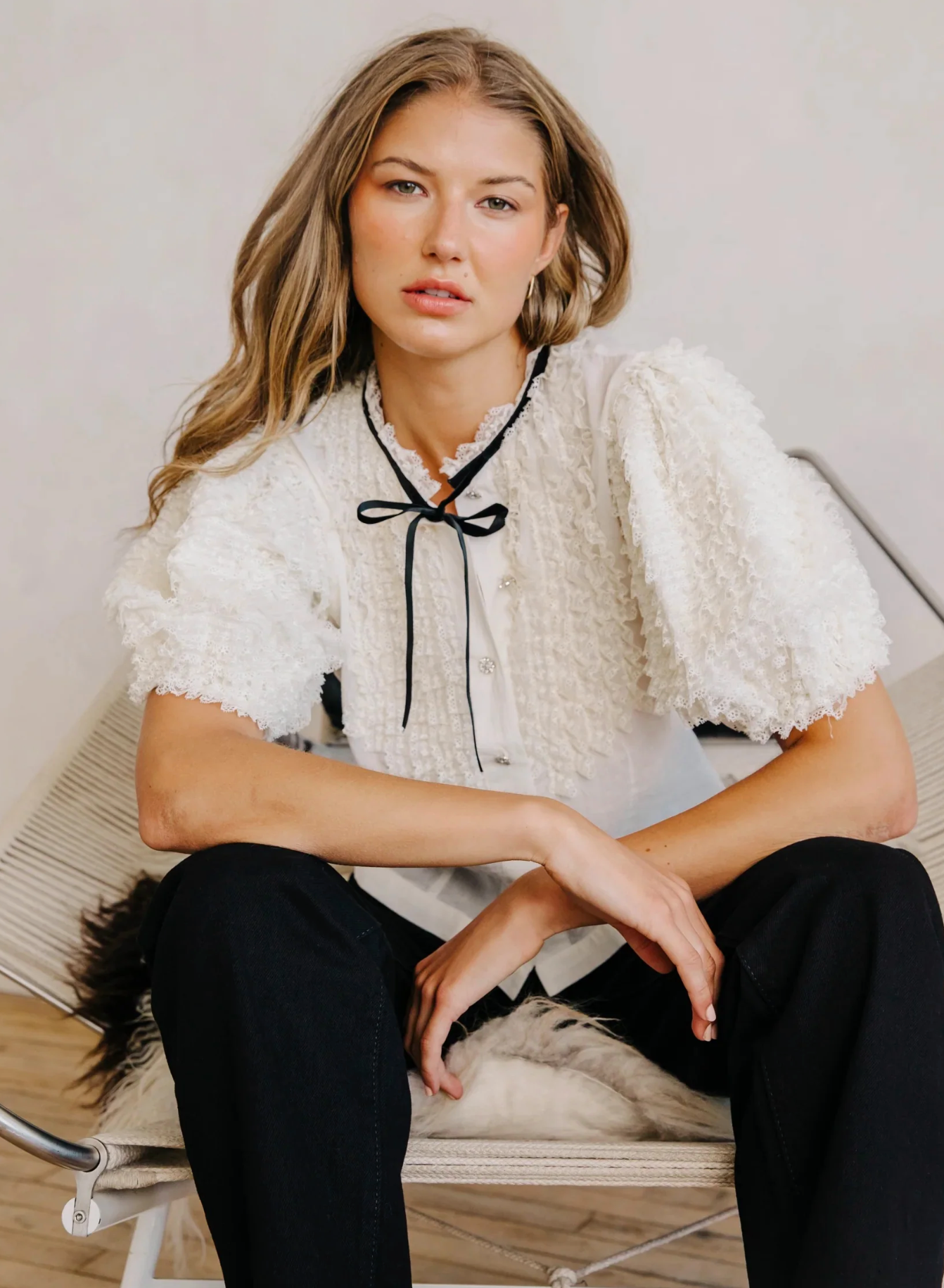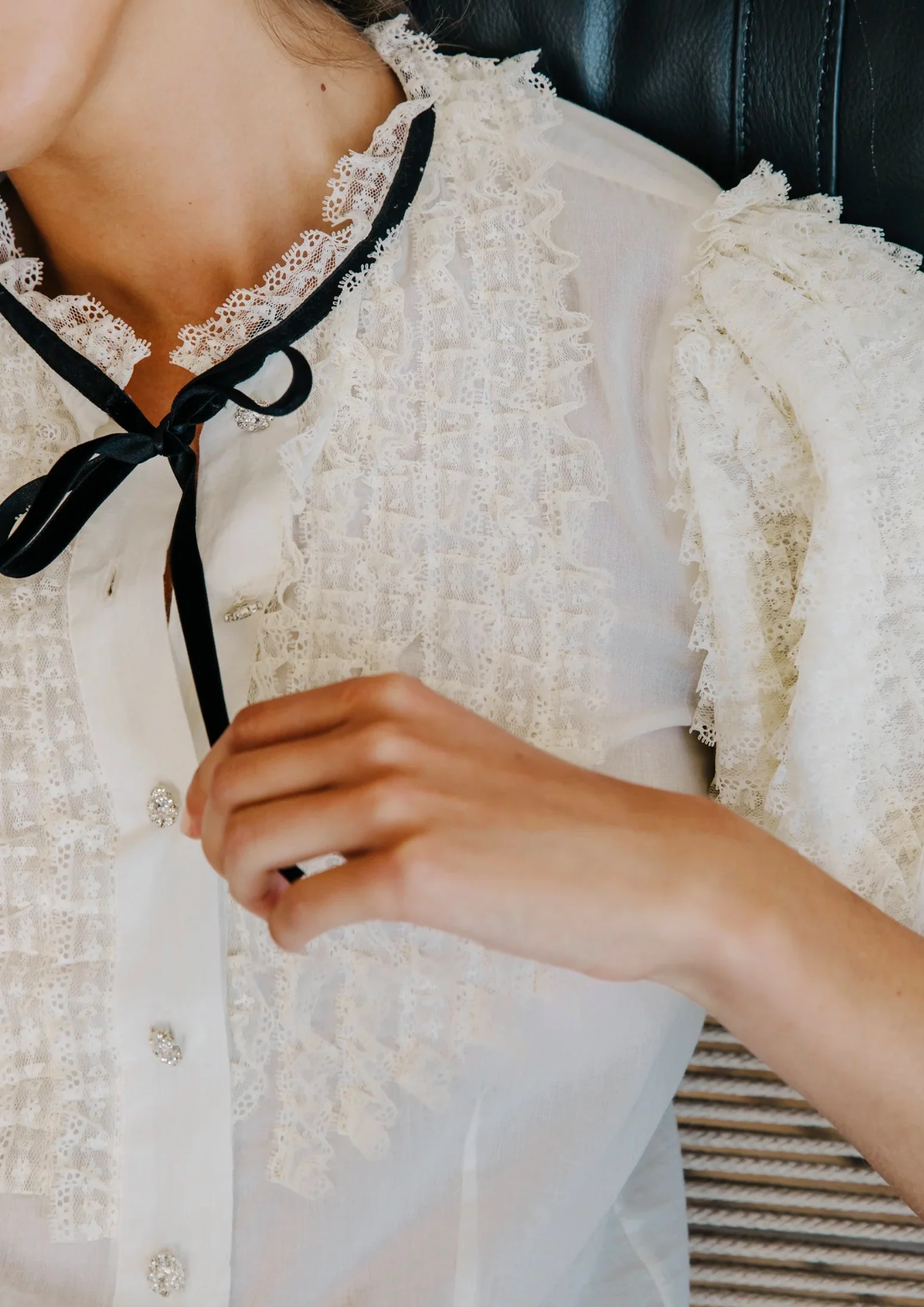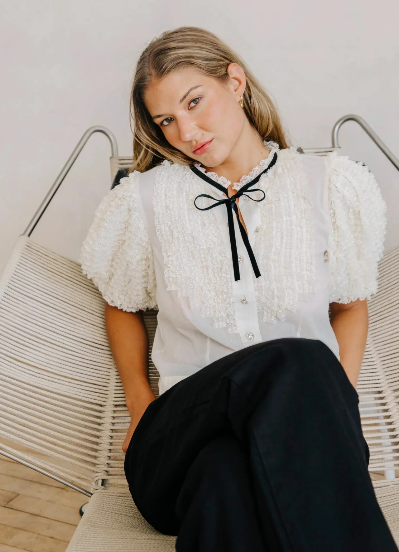The Oceane Top is a romantic blouse with lace trim ruffle detailed sleeves, crystal buttons, and a dainty black velvet tie-neck detail — perfect for effortlessly polished styling.