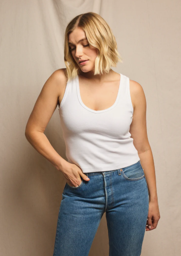 This silhouette shouldn’t be a stranger. it’s our bestselling tank now offered in a v neck. routinely paired with classic denim or one of our relaxed french terry bottoms, you will want to add this ribbed tank into your weekly wardrobe rotation.